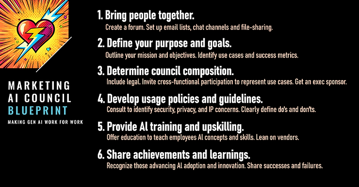 Meet trailblazer Jessica Hreha, the Head of Integrated Marketing and Demand Content Strategy at VMware. Jessica founded VMware’s industry-leading Marketing AI Council and regularly speaks on the topic. Be sure to follow her here on Linkedin. The VMware Marketing AI Council’s charter is to educate and empower VMware marketers to use GenAI tools responsibly and effectively. Below are the steps of the VMware Council blueprint.