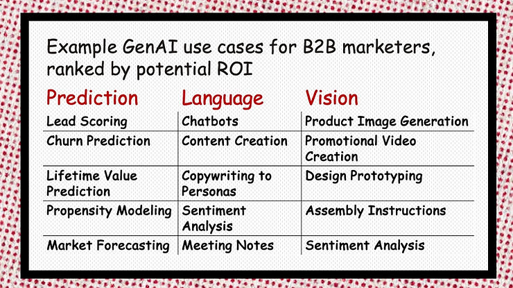 Enterprises are slow to adopt genAI, despite all the discussion. There are many reasons for this hesitation, including risk, data complexity, ethical concerns, skill shortage, lack of education, limited exposure to tools, and uncertainty around use cases. One of the biggest challenges in that list is figuring out the best way to apply genAI, the use case. By identifying a strong use case, exploring the right tools, and making the business case, marketers can lead the way toward thoughtful genAI adoption.