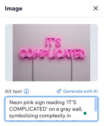 Pro Tip: Have generative AI draft your alt text to ensure it fits the optimized character count. Here’s the alt text for this post’s hero image: ‘Neon pink sign reading ‘IT’S COMPLICATED’ on a gray wall, symbolizing complexity in decision-making, relationships, or technology.’
