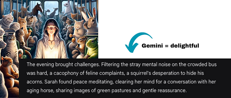 Sample responses for the whimsical/fantastical challenge. The image took 2 prompting steps to get to this.